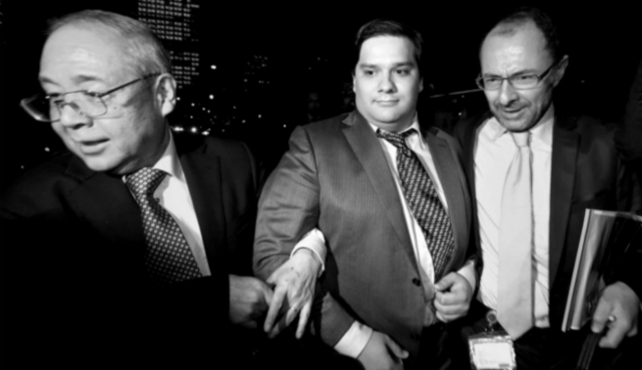图为比特币交易平台 Mt.Gox CEO 马克·卡普斯(Mark Karpeles)上周五离开东京地方裁判所时被护送的场景。